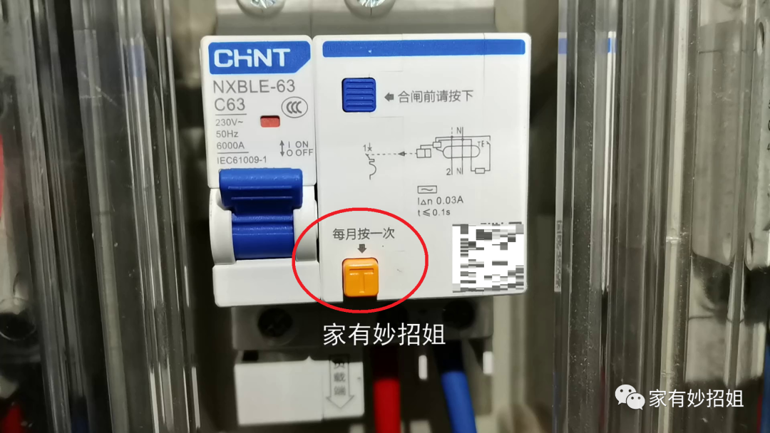 在这个漏电保护器开关的旁边,还有个小小的开关,可能很多朋友都没有注意过,在这个小开关的旁边还写了几个小字:“每月按一次”。为什么要每月都按一下这个小开关呢?其实是为了检查这个漏电保护器是否失灵了。当我们按下这个小开关后,漏电保护器能够正常的跳闸,就说明他还是完好的,可以正常使用。