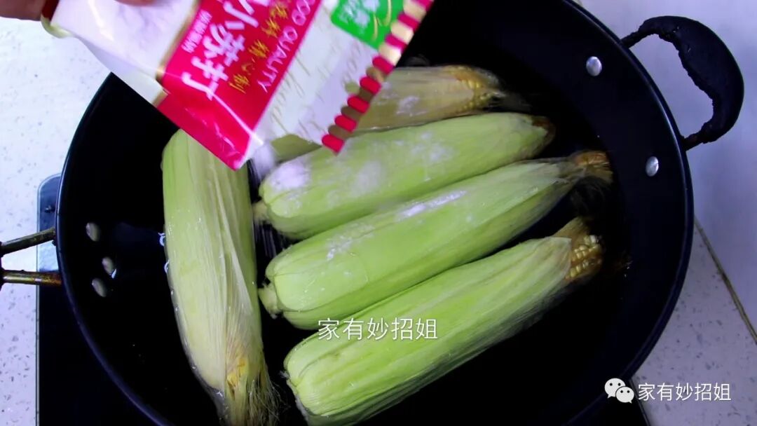 接着我们再往里面倒入一点食盐,俗话说的好,要想甜加点盐,我们煮玉米时加入一点食盐,就可以更好的激发出玉米的甜味。