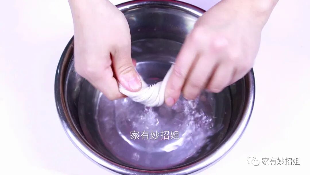 大概浸泡上一两分钟之后,我们将纱布稍微拧干水分拿出来。