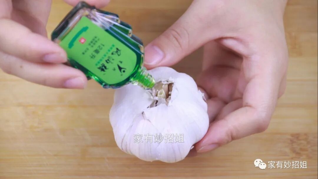 口罩剪开后,它是有三层的,我们扯开其中的一层,把刚刚切好的大蒜放在里面。然后再准备一瓶风油精,在大蒜上滴入多一些的风油精。风油精的气味独特,它也能起到一个很好的驱蚊作用。