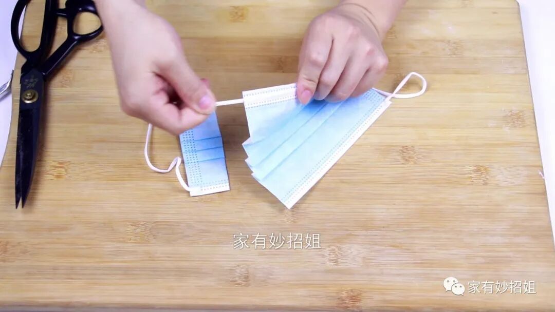 接着,我们再准备一个一次性的口罩,用剪刀先将口罩的一端剪开,在口罩的一边还有一个钢丝条,我们把这个钢丝条抽出来先放一边。