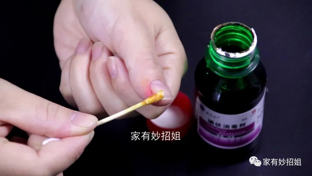 接下来我们准备一瓶碘伏,用棉签蘸点碘伏把我们修剪过的地方擦一擦,消一下毒,以免发生感染。