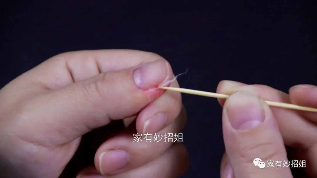 在我们刚刚剪下来的指甲部分,是有一个小缝隙的,我们只需要将沾过酒精的小棉花塞进这个空隙里面,尽量往里面塞一些,这样我们就把指甲跟肉隔开来了,指甲再长出来就不会长到肉里面去了。