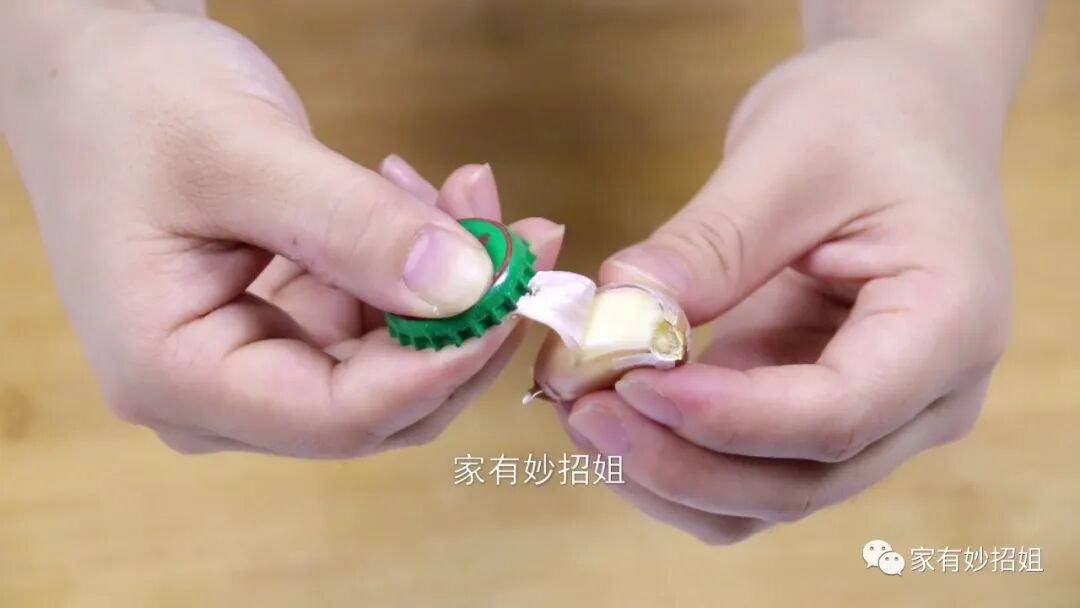 我们还可以拿上一个饮料瓶盖,用瓶盖代替我们的指甲来剥蒜皮,这样既不伤手,大蒜的辛辣味也不会留在我们的手上。
