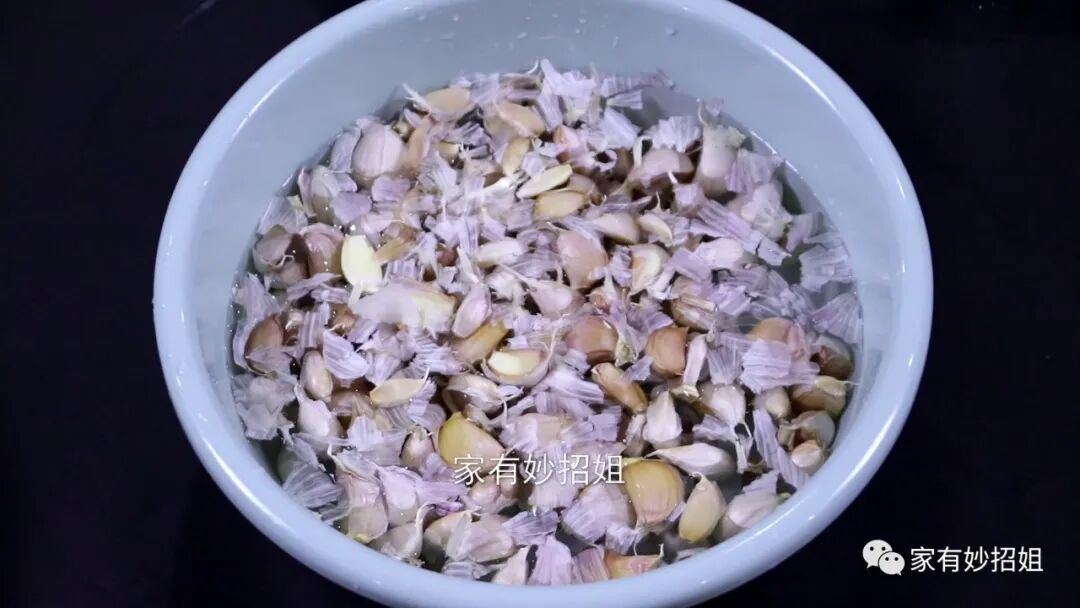 大概浸泡15分钟之后,我们就可以来给大蒜剥皮了。大蒜经过浸泡后,蒜皮就会被泡软和蒜子之间就有了缝隙。