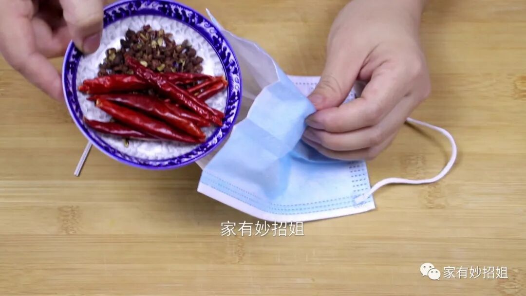 花椒和干辣椒都是我们日常生活中经常会使用到的调味品,其实我们也可以利用它来去除米虫。方法也很简单,我们先准备一个一次性的口罩,先将口罩的一端用剪刀剪开,在口罩的一边还有一根钢丝条,我们把钢丝条也取出来。口罩都是有三层无纺布的,我们分开其中的一层,就变成了一个口袋的样子,只需要在里面放入适量的花椒和干辣椒。