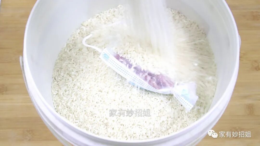 然后用取出来的钢丝条把口罩扎紧,这样一个驱虫包就制作好了。我们只需要把它放在大米里就可以有效的驱赶米虫了,这是因为花椒和干辣椒的气味都比较辛辣刺激,而这种气味是米虫所不喜爱的,我们把它放在大米里,就可以起到一个去除米虫和预防大米生虫的作用。要是大米比较多的话,也可以多做上几个,在大米的底部、中间、上面分别都放上一个,这样就可以有效的防止生虫了。