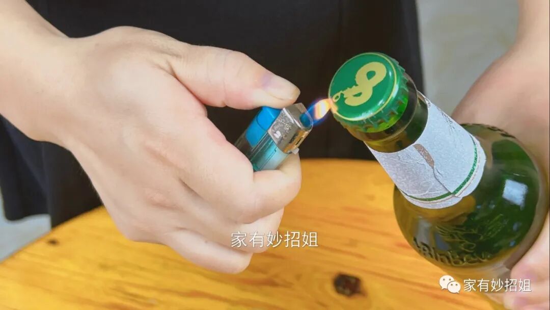 接下来,我们只需要拿张纸巾包裹住瓶盖,轻轻一揭,就可以将瓶盖打开了。其实它就是利用到一个热胀冷缩的原理。我们用打火机对瓶盖的四周进行加热时,高温就会使啤酒内部的气体迅速膨胀,在压力的作用下,瓶盖就会有所松动,所以我们就能轻松把瓶盖打开了。