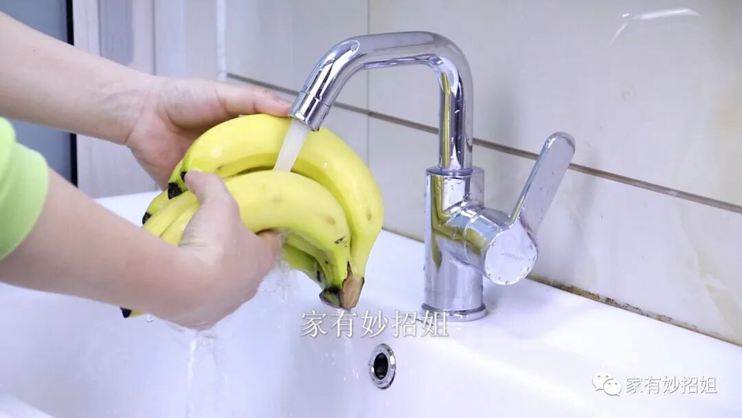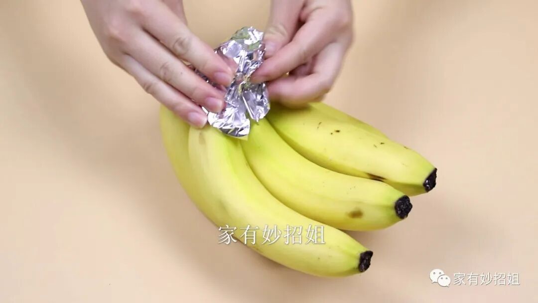 另外,香蕉好吃,但不耐保存,要是香蕉买多了,该如何延长香蕉的保质期呢?方法也特别简单,我们只需要把香蕉放在水龙头冲洗一下,将表面的催熟剂冲洗掉。接着再用一点锡箔纸把香蕉的根部包裹起来。这一步的目的,是可以阻止香蕉根部散发出催熟的乙烯气体。