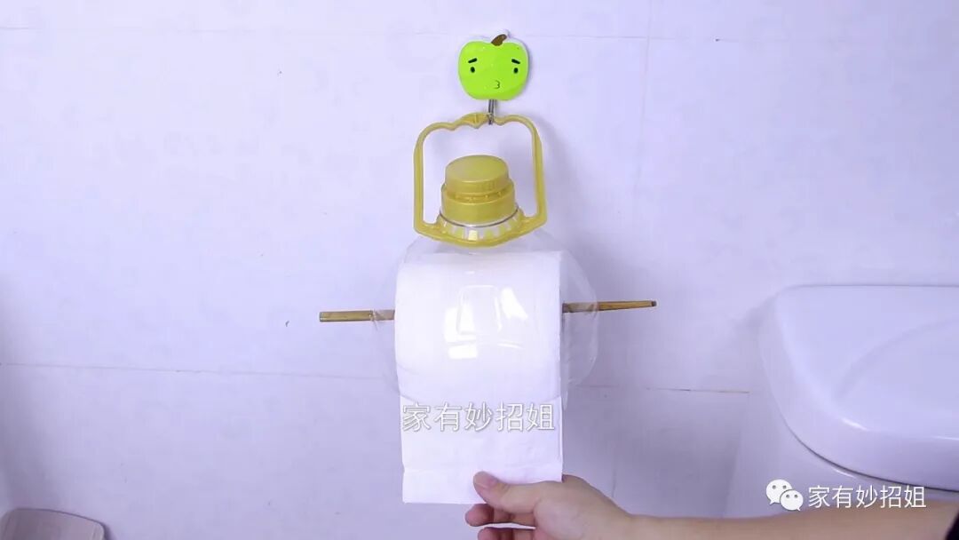 接下来,我们再来改造油桶的上半部分。同样的,先用电烙铁在上半部分的两边,分别戳上一个筷子大小的洞。然后再拿一根筷子穿进洞中,在筷子的中间放上一卷纸巾,我们把它挂在卫生间里。用纸的时候,随用随撕,非常的方便。而且上面还能防水,我们这样放置,再也不用担心洗澡时,水会将卫生纸打湿了。如果今天的文章对您有帮助,那就点一个关注,点一个赞,感谢您的支持。