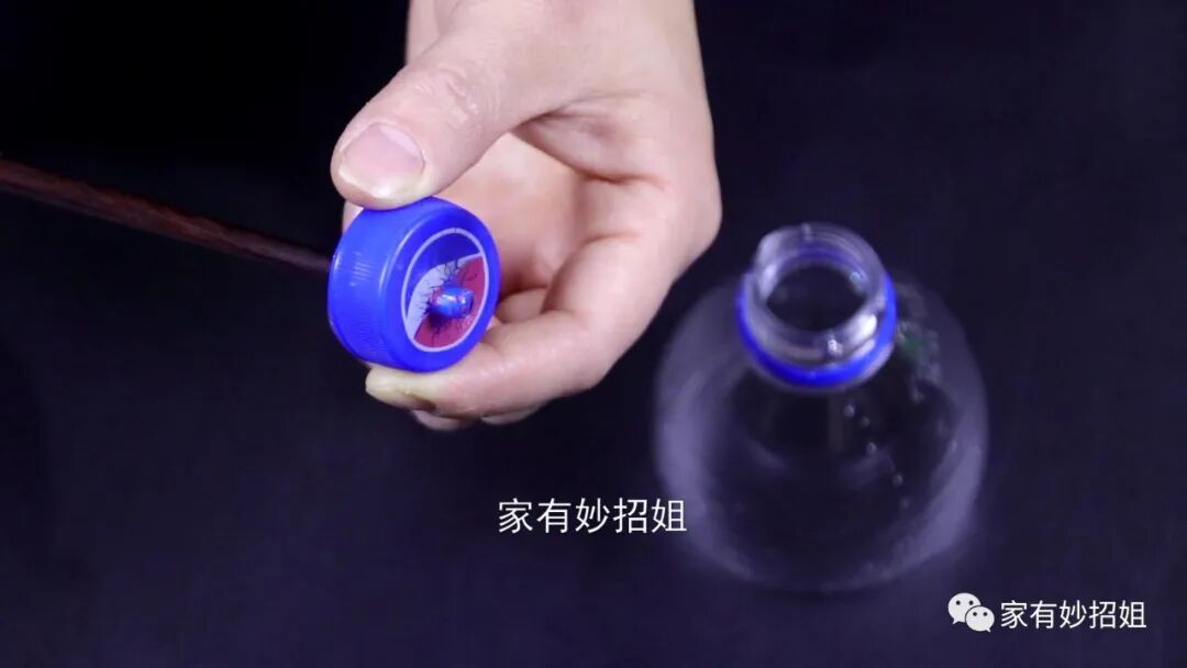 毛边烫好后,我们将瓶盖取下来,然后一手抓住瓶盖,另一只手用打火机把瓶盖的外面烫一烫。瓶盖是塑料的,遇热后就会被烧融化变软。当瓶盖的外面已经烧融化变软后,我们再拿一根筷子,从瓶盖的里面往外戳,戳的时候不要心急,要慢慢的戳,这样瓶口的塑料就会慢慢的凸起来。等瓶口凸起来一点了,我们不要动,让它冷却定型。瓶口完全冷却定型后,再将筷子抽出来,用剪刀在凸起的地方剪上一个小洞,然后再把盖子给它盖回去,这样一个好用的漏斗就制作完成了。