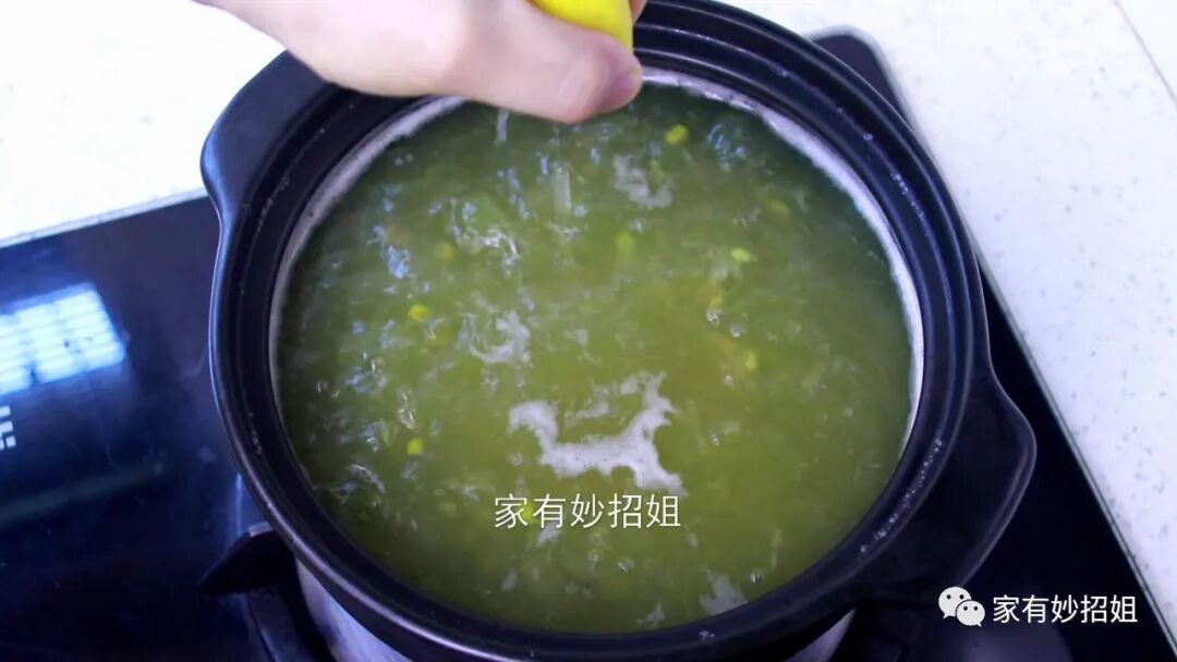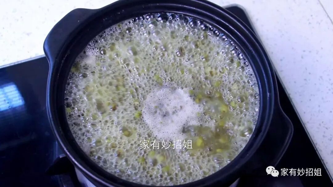 绿豆完全结成冰后,我们就可以开始来煮绿豆汤了,相信很多朋友平时煮绿豆汤,就是用电饭煲来煮的,这样不仅费时,还很难煮开花来。其实我们煮绿豆汤最好是采用砂锅,它受热更加均匀,可能很多朋友煮绿豆汤出现发红或发黑的情况,其实这是因为使用了铁锅或不锈钢锅煮的原因,因为绿豆皮中的类黄酮和金属离子作用后,会形成颜色较深的复合物。所以煮的绿豆汤,就会出现发红或发黑。不仅如此,这样的绿豆汤喝了,还可能会造成肠胃的不适和消化不良,所以我们煮绿豆汤最好是采用砂锅。我们将冰冻好的绿豆放进砂锅后,再往里面加入清水,水要多加点,一次性给足,尽量不要中途加水,这样熬煮出来的绿豆汤,味道才更加浓郁。