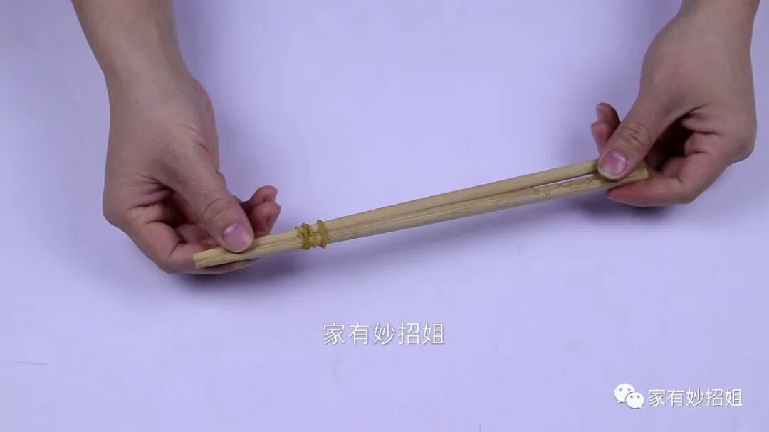 接下来,我们只需把这个纸张夹在筷子的中间部分,那么这样一个剥瓜子的神器就制作好了,我们来看看是如何操作的吧。