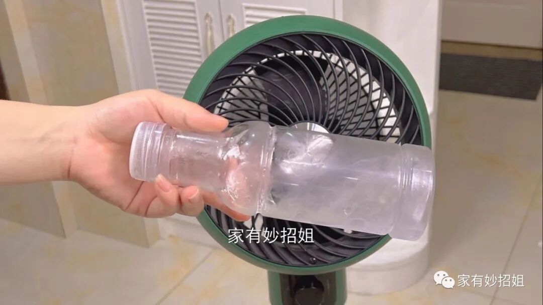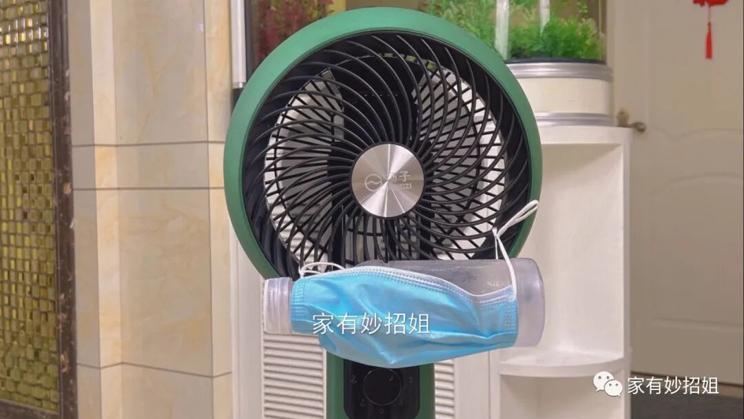 接着,我们再将结成冰块的塑料瓶放在口罩的中间,口罩就起到一个固定塑料瓶的作用。这样我们再开风扇,吹出来的风就变凉爽了。这是因为风扇前面的冰块,在融化的过程中就会使周围的温度降低,而风扇吹出来的风自然也就变得凉爽了起来。当这一瓶融化后,我们又可以将它放进冰箱里重新冰冻,把另外一瓶拿出来交替着使用。这个使风扇吹风变凉爽的方法,简单又实用,你也可以试试。