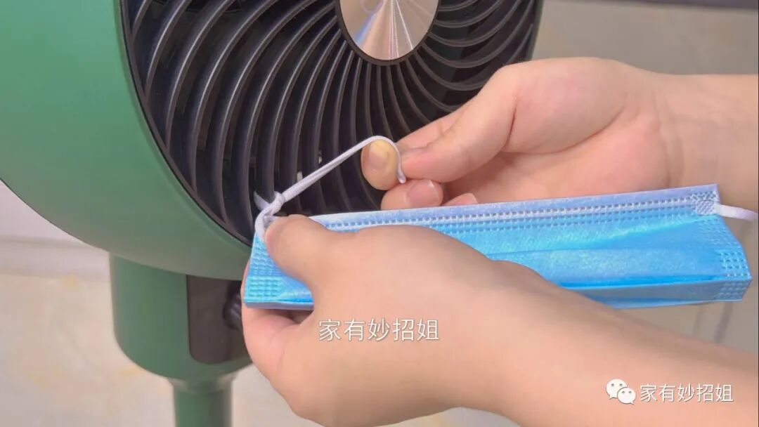 当塑料瓶里面的水都冷冻成冰块后,我们拿出其中的一瓶,然后再准备一个一次性的口罩,先将口罩两边的挂耳绳分别固定在电风扇网罩的两边,可以打上一个死结,以免不牢固。
