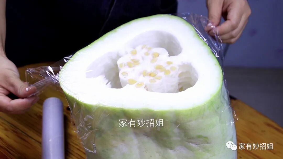 接着我们再准备保鲜膜,用保鲜膜把冬瓜的切口处包裹起来,保鲜膜可以起到一个隔绝空气的作用,这样也能隔绝外部的细菌,以及一些虫子之类的来吸食冬瓜。