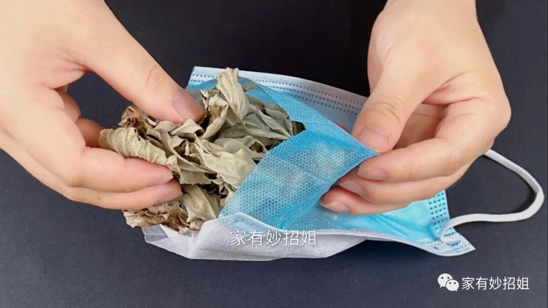 艾草的香味非常独特,我们也可以利用它来制作一个香包。先准备一个一次性的口罩,用剪刀将口罩的一端剪开来。接着,再把口罩其中的一层无纺布扯开,这样就变成了一个小口袋的样子。接下来,我们只需要摘上一点艾叶塞入口罩里面。然后再用剪下来的挂耳绳把口罩扎紧,那么这样一个艾草香包就制作好了。