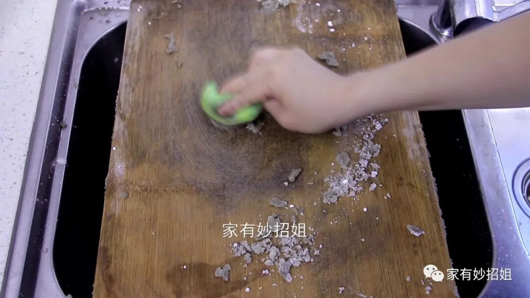 接下来,我们继续用百洁布来将菜板擦拭一遍。