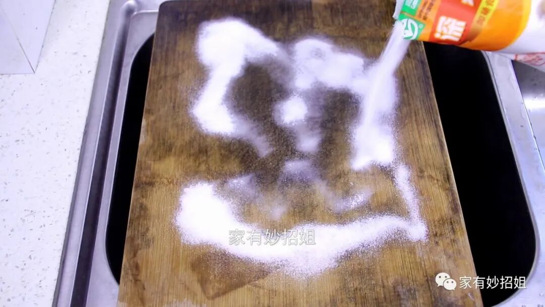 接着,我们在菜板上撒入一点食盐,食盐不仅可以杀菌消毒,而且它的细小颗粒还能增加摩擦力。接下来,我们只需要拿上一块百洁布,用百洁布粗糙的一面蘸取食盐来擦拭菜板,这样就可以将菜板的缝隙和角角落落都擦拭到了。
