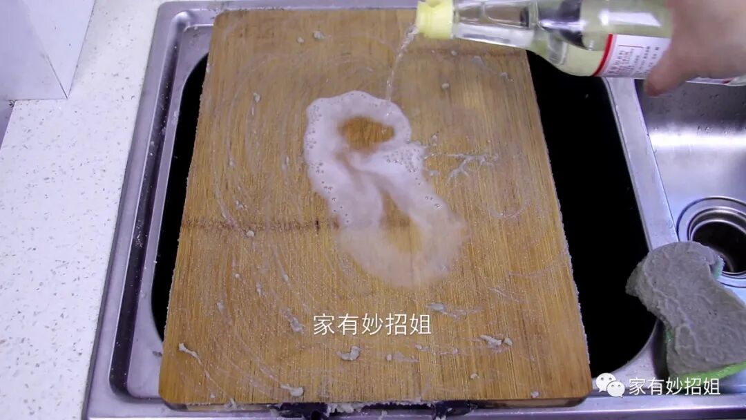 菜板擦拭好,我们还需要往菜板上倒入一点白醋。白醋具有软化的作用,可以将菜板上一些顽固的污渍软化,而且它还能起到一个去除异味的作用。