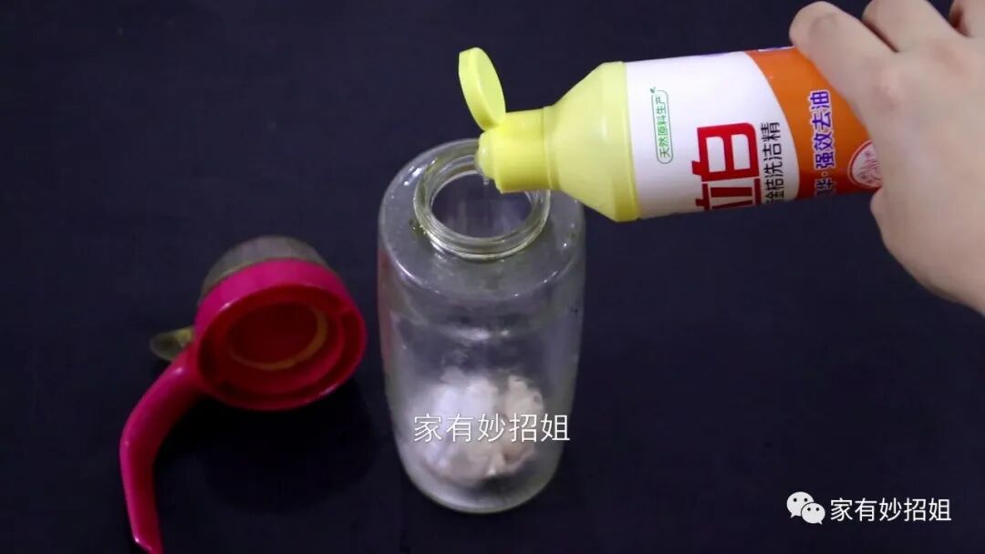 然后我们再挤入一点洗洁精,洗洁精不需要太多,一两滴就可以了。洗洁精也有去除油污的功效。