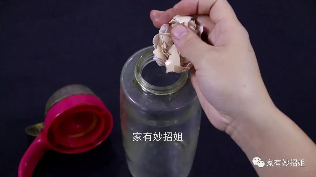 像平时我们吃鸡蛋的时候就会剩下鸡蛋壳,这个鸡蛋壳不要扔了,我们把它稍微捏碎一点,然后放进油壶里面。