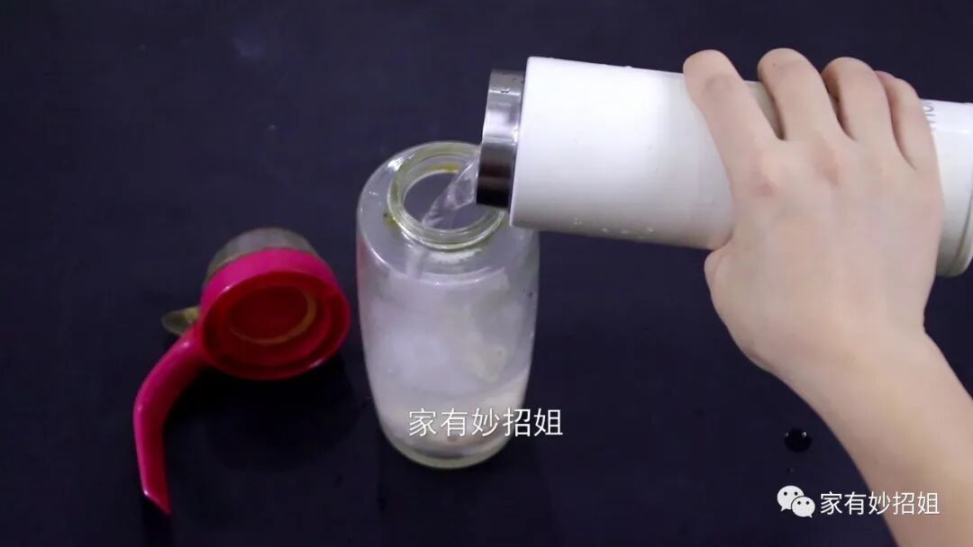 大概摇晃三到五分钟的样子,我们将里面的水倒掉。这个时候就可以发现,油壶里面的油污都被清洗干净了。