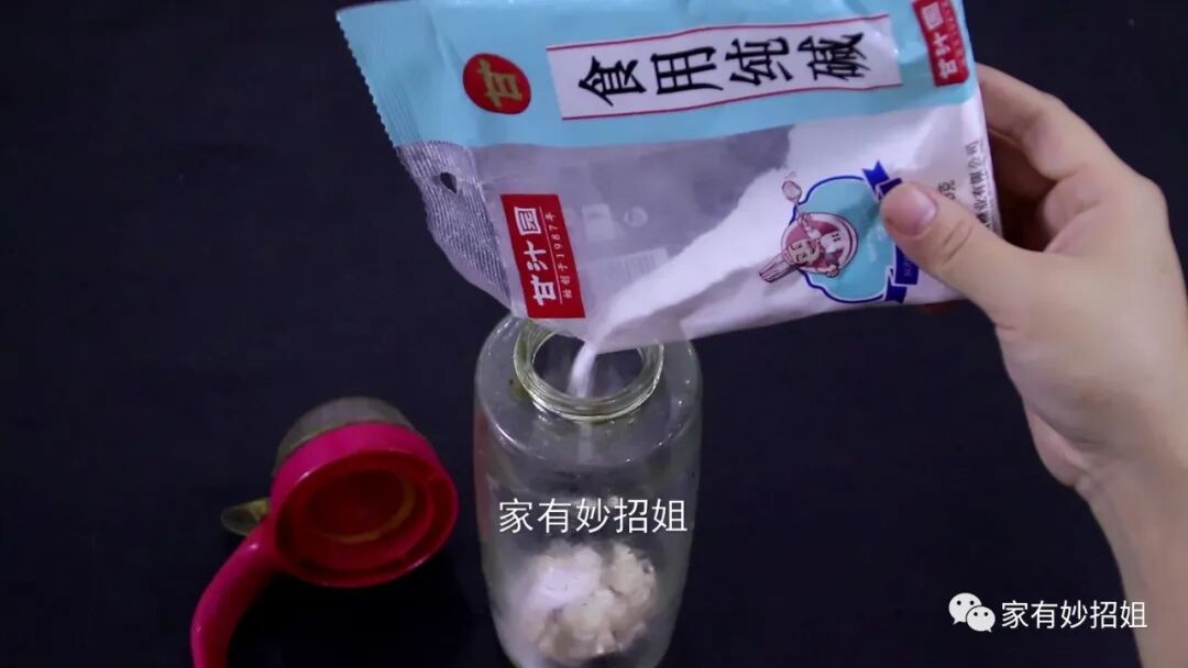 接着在里面倒入一些食用碱,食用碱具有很强的去油污作用,能分解油壶内壁上面的油污。