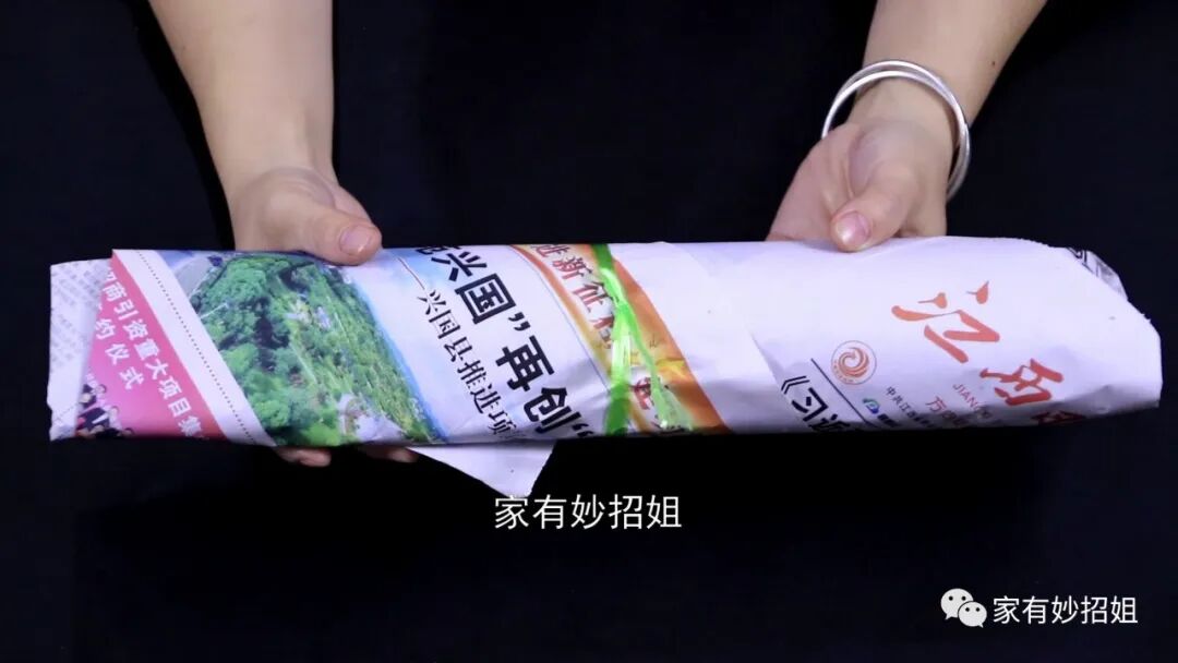 用报纸包裹好,我们再拿根绳子在报纸的中间捆一下,以免它松开来,这样就处理好了。报纸可以使韭菜保持一个干燥的环境,我们将它放在家里温度比较低的地方,这样可以保存韭菜五到七天都新鲜。