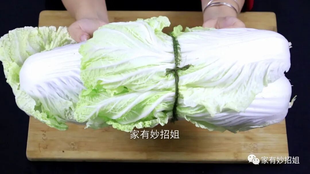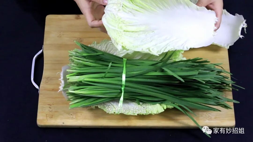 接着,我们再拿上几片白菜叶,把白菜叶放在案板上,然后再将捆好的韭菜放在白菜叶上,用白菜叶将韭菜包裹起来。我们可以给它包裹上几层。