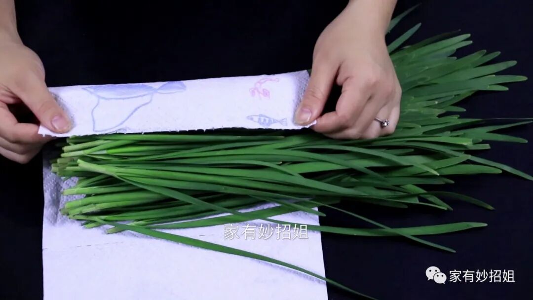 第二个方法:报纸保存法。我们的韭菜上面难免会有一些水分,在保存之前我们需要将韭菜摊开,放在阴凉的地方,将表面的水分晾干。水分晾干后我们拿上两张厨房纸巾,用厨房纸巾将韭菜包裹一下。