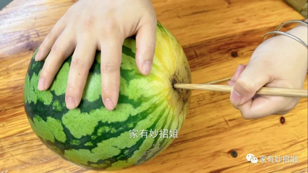 可能很多朋友在切西瓜的时候,就是将西瓜表面清洗一下就直接开切了,这样西瓜往往就会炸开来。其实在切西瓜之前,我们需要拿上一根筷子,用筷子的小头对准西瓜的果脐处,接着再把筷子慢慢的插入到西瓜内部,速度不能太快了,不然西瓜也会炸开来。大概插进西瓜里面3CM的样子就可以,接着再将筷子拔出来。