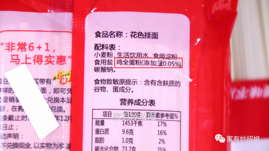 但其实我们翻到面条包装的背面,查看一下配料表就可以发现,鸡蛋挂面里面加的是鸡全蛋粉。而鸡全蛋粉是采用新鲜鸡蛋为原料,经过抽检、验光、洗蛋、消毒、分离、过滤,等等一系列的工序制作而成。经过了这么多道工序,鸡蛋里的营养价值已经大打折扣了,而且鸡全蛋粉添加的量也非常的少。我们如果想要鸡蛋的营养,在煮面的时候直接打入一个新鲜的鸡蛋还更好一些。所以我们在购买挂面的时候,也没有必要刻意的去买鸡蛋挂面。
