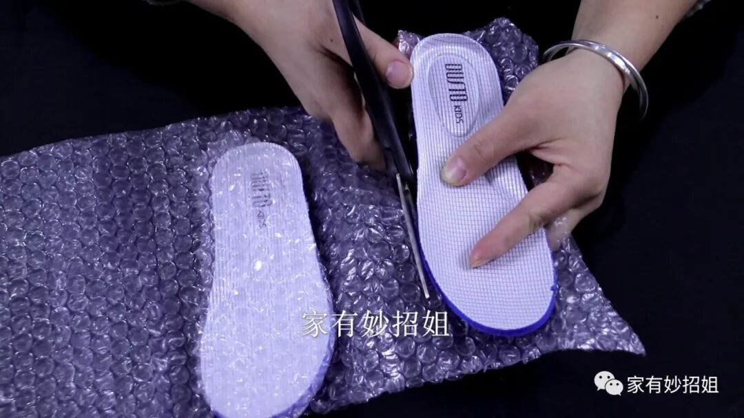 我们还可以把气泡垫做成一双防震鞋垫,方法也很简单,只需要先将鞋子里的鞋垫拿出来,然后把它放在气泡垫上,用剪刀比着鞋垫的大小,剪出一块一样的气泡垫。一只剪好,接着把另一只鞋子的鞋垫也拿出来剪好,这样就改造完成了。