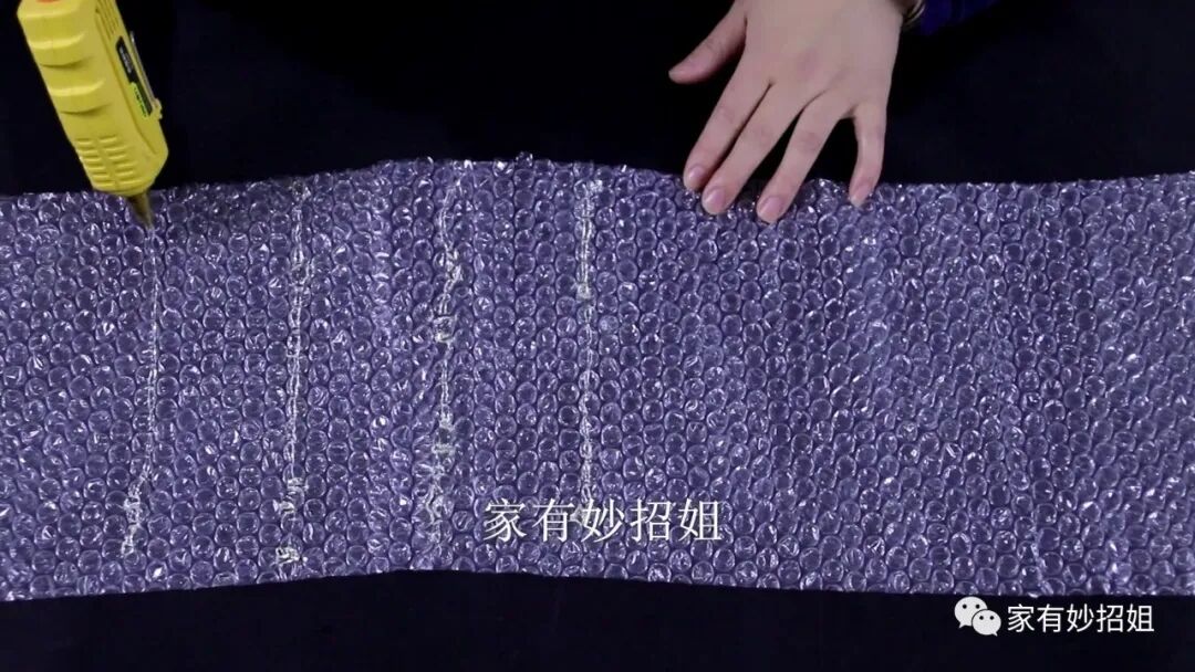 在我们家里通常都会备有很多的工具,比如:剪刀、螺丝刀、老虎钳、美工刀等,这些工具可能不常使用到,但也都是家里必不可少的,平时就需要我们好好的收纳起来了。不然要用的时候找也找不到,而且这些工具都很坚硬,要是被孩子拿着玩耍就很危险了,不仅容易伤到自己,而且要是刮花了家具也是不好的。其实收纳这些工具,我们也可以利用上气泡垫。首先需要准备一块大点的气泡垫,将气泡垫从中间折叠一下,然后用热熔胶枪在折叠的一边打成格子状的。