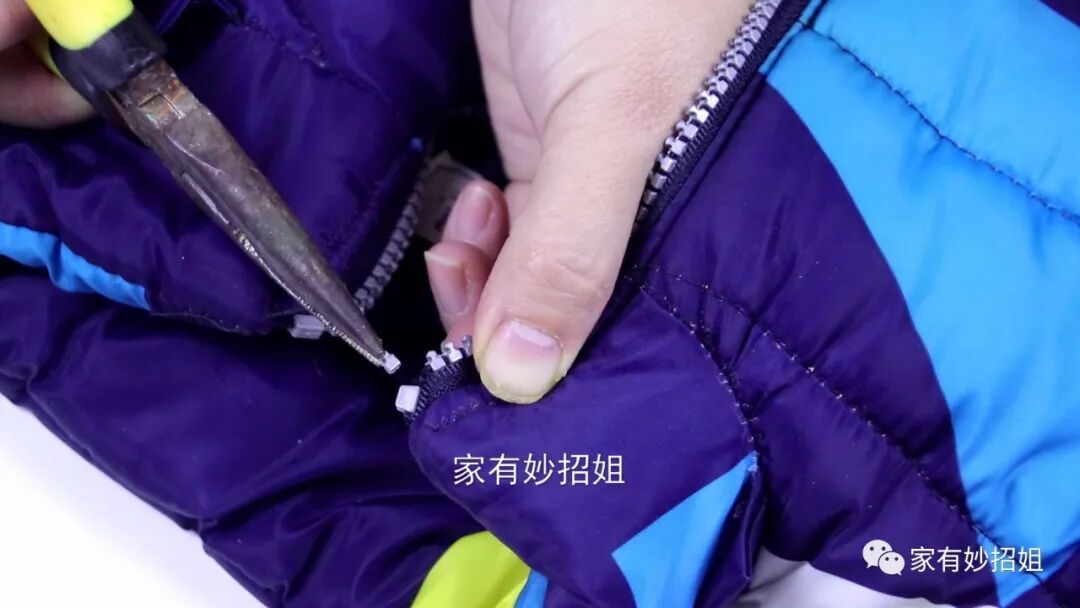 我们取的时候,可以拿一个老虎钳来拔。但由于这个拉链是塑料的,我们在拔的时候,不要夹的太紧,而且也不要一次性用力的往下拔,最好是慢慢的将这个链齿给它拔下来。