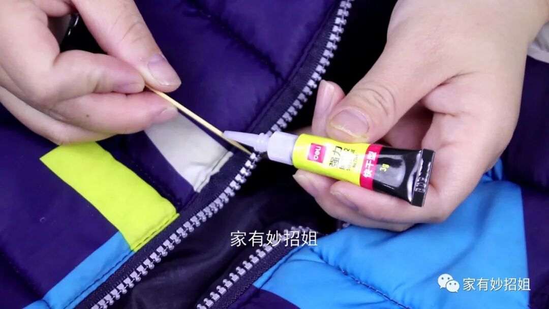 这个时候我们就可以发现,链齿已经牢牢地夹在布料上面了,为了防止它下次掉落,我们还可以用胶水将它粘一下。粘胶水的时候,我们也可以用牙签沾点胶水涂抹在上面,这样就可以避免胶水弄到衣服其它的部位了。