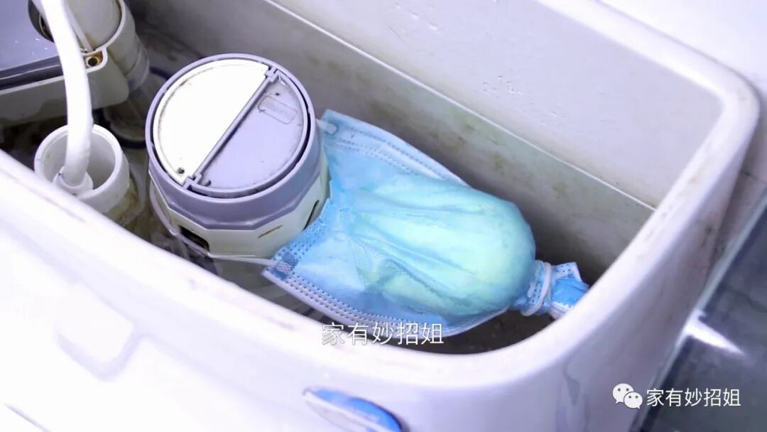 我们只需要将马桶后面的水箱盖子打开,把这个制作好的口罩包挂在水箱的按钮上,让口罩里面的硫磺皂浸泡在水中。