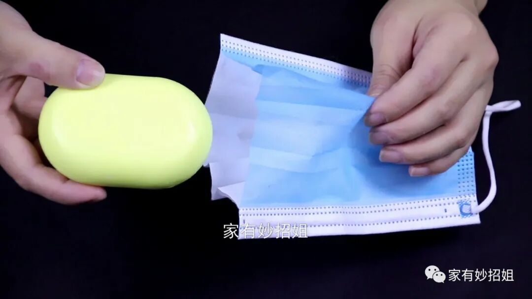 方法也很简单,我们拿一个一次性口罩,先将口罩的一端剪掉。然后在口罩的一边还有一根钢丝条,我们也将它抽出来。接下来再拿一块硫磺皂,把硫磺皂放进口罩里面。