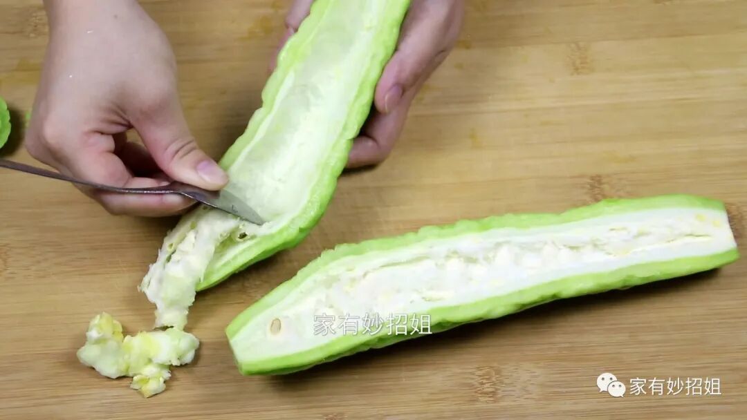 在苦瓜壁上还有着一层白瓤,这层白瓤我们也要将它彻底的挖干净,这也是苦瓜很苦的一个原因之一。