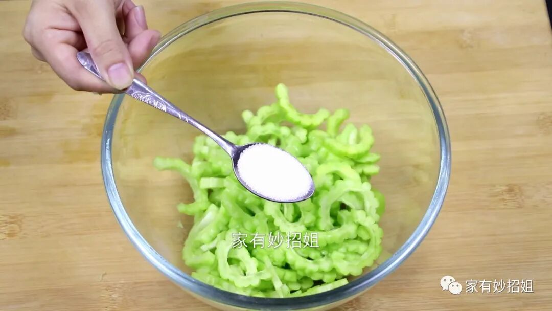 当我们将苦瓜里面的白瓤都挖掉之后,我们再将苦瓜按照自己平时切的方式,把苦瓜都切成片。苦瓜切好,我们把它放在一个大碗中,然后往里面倒入一勺食盐,搅拌一下,使每片苦瓜上都粘上食盐。食盐可以杀菌消毒,苦瓜的表面都是凹凸不平的,在一些缝隙里难免会隐藏一些脏东西,食盐就能有助于将苦瓜清洁的更加干净。而且食盐还能杀出苦瓜里面的苦水。就这样让苦瓜腌制上七八分钟的样子。