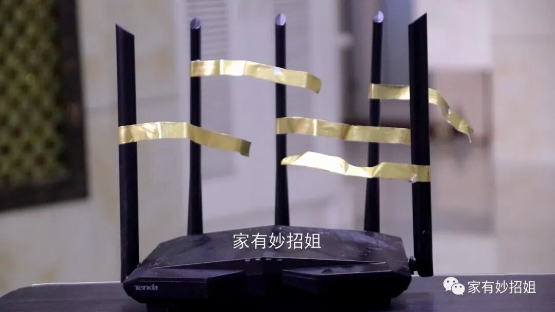 在我们的路由器上面都会有几根信号杆,我们将剪好的锡箔纸用双面胶或者透明胶,在每根信号杆上都粘上一个。粘的时候,我们最好是把位置错开来,粘好就完成了。我们再来使用WiFi信号的时候就可以发现,它的信号变强了,不管是在家里的哪个角落都可以收到信号。
