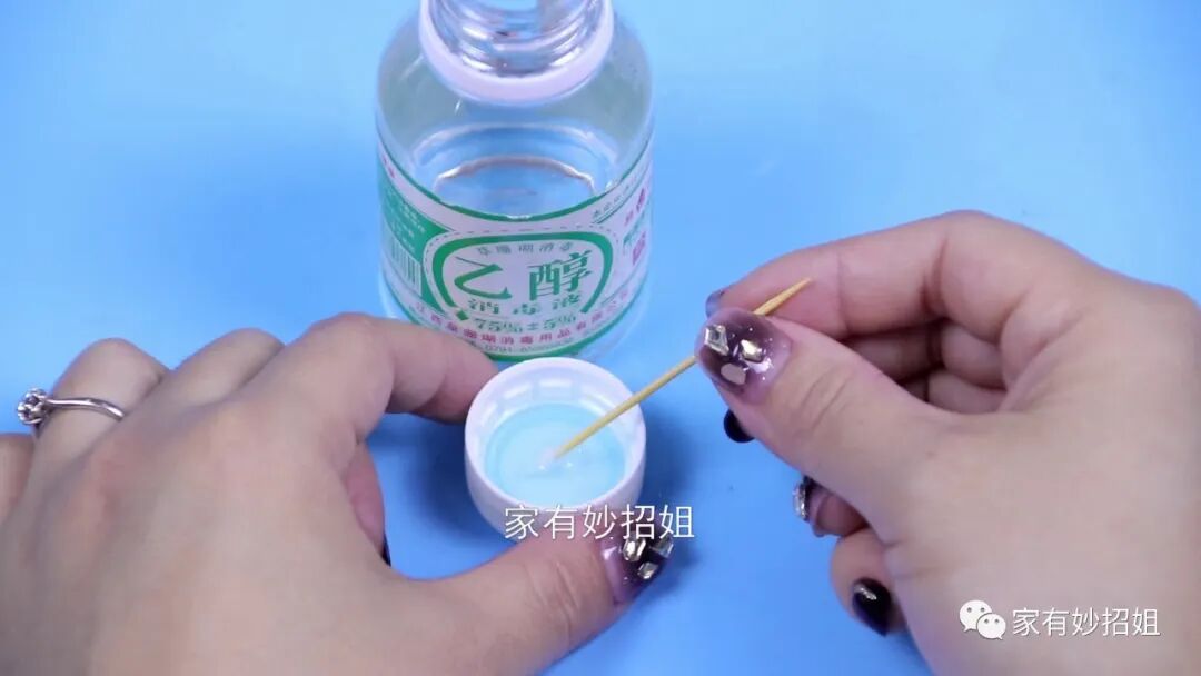 接着我们在碗里倒上一点酒精,没有酒精的也可以用白酒,用牙签蘸取酒精。