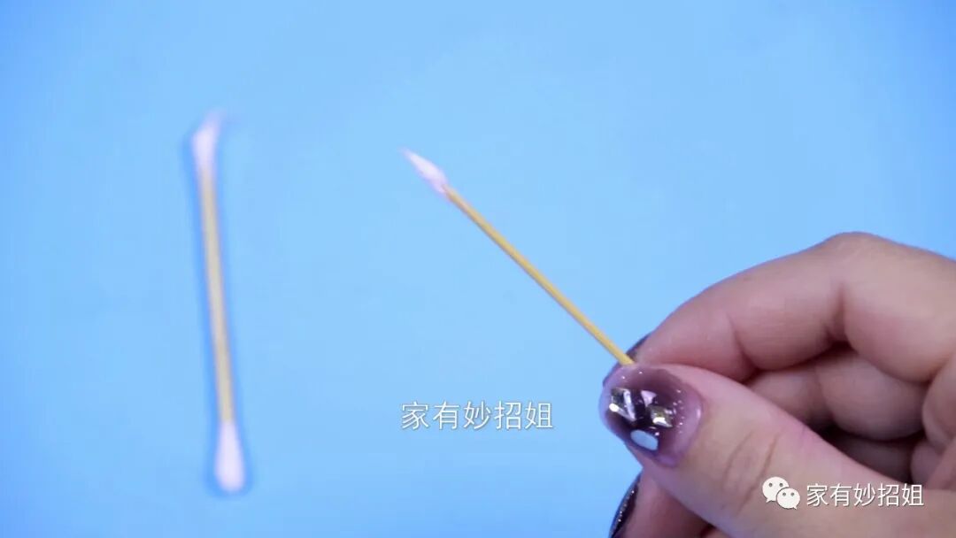 清洁的方法也很简单,我们先准备一根牙签,然后再拿上一根棉签,在棉签上都是有一团小棉花的,我们扯下一点小棉花,然后把它卷在牙签上面。