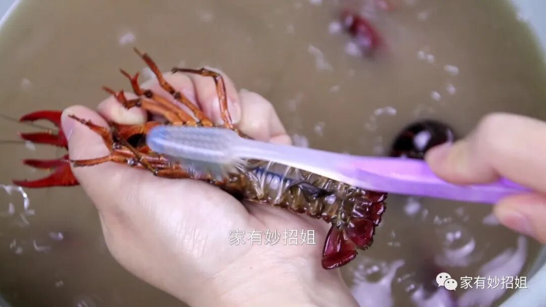 浸泡的时间差不多了,我们再拿一把废旧的牙刷,把小龙虾每个都刷一刷。在抓小龙虾的时候,我们注意不要被它的大钳子给夹到了,可以将小龙虾放在手上,用大拇指把它的两个大钳子固定住,接着再用牙刷来刷洗它的腹部。牙刷的刷毛非常的细小,可以很好的深入到小龙虾的缝隙当中,将它表面的脏东西都刷洗下来。