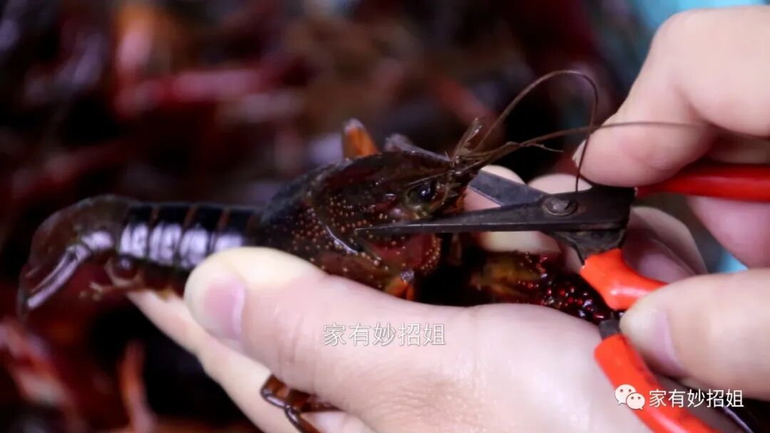 把每个小龙虾都刷洗过后,我们再把小龙虾的背面朝上,用剪刀从小龙虾的眼睛部分斜着剪一个倒三角。