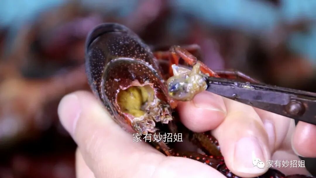剪掉后我们就可以看到,虾头里面黑黑的部分就被连带着拉了出来,这些都是小龙虾的内脏,非常的脏,我们要将它完全去除干净。