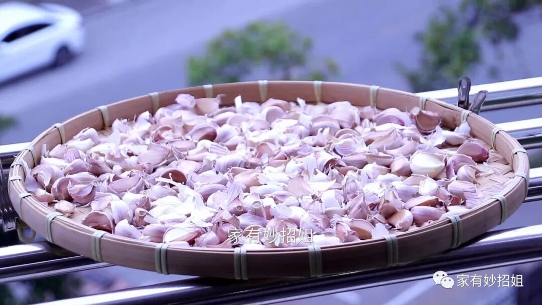 同样的,我们先把大蒜都掰成一颗颗的,然后再将大蒜摊开,放在太阳下晾晒上一两天。大蒜经过晾晒后,蒜皮就会变得非常干燥,而且一碰还容易碎掉,那么这个时候我们就可以来剥大蒜了。
