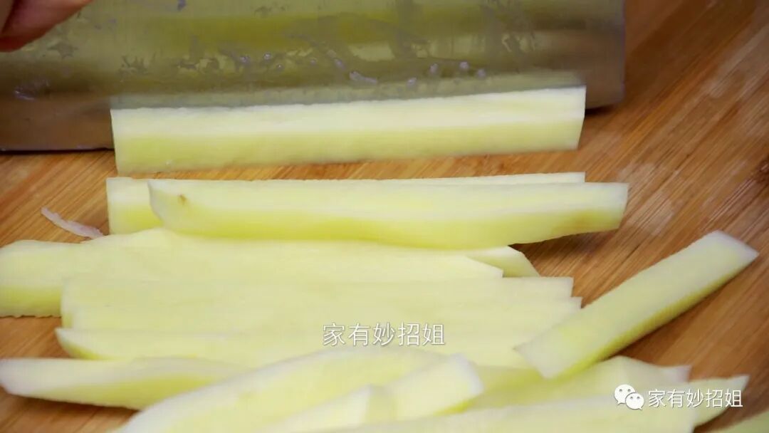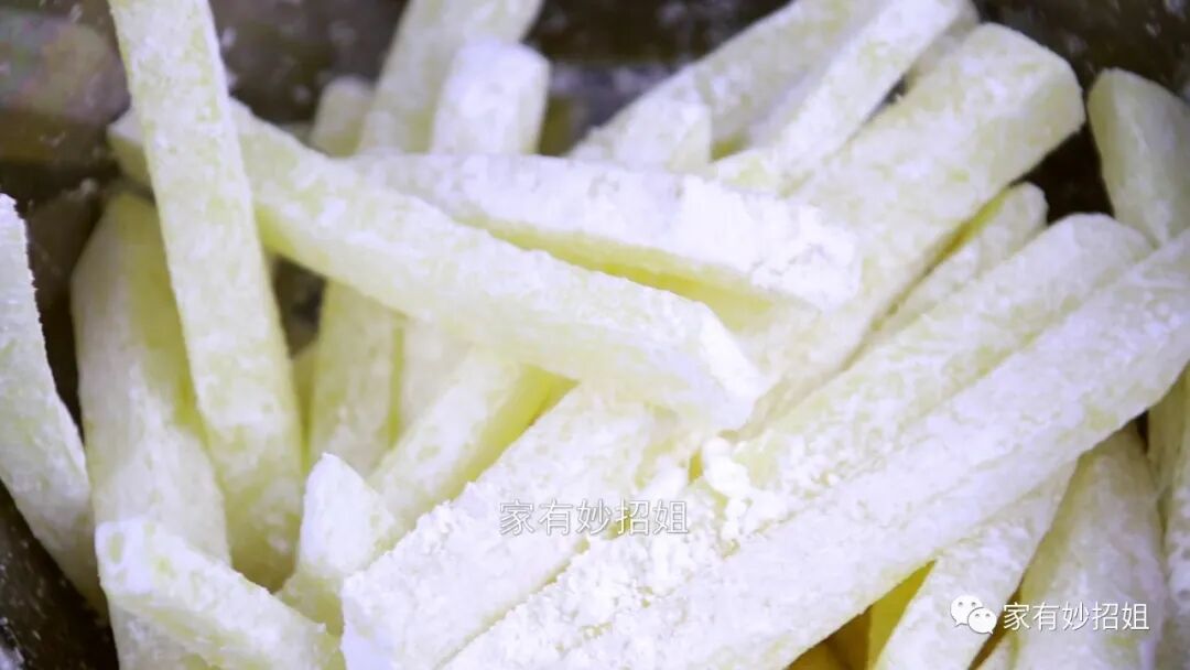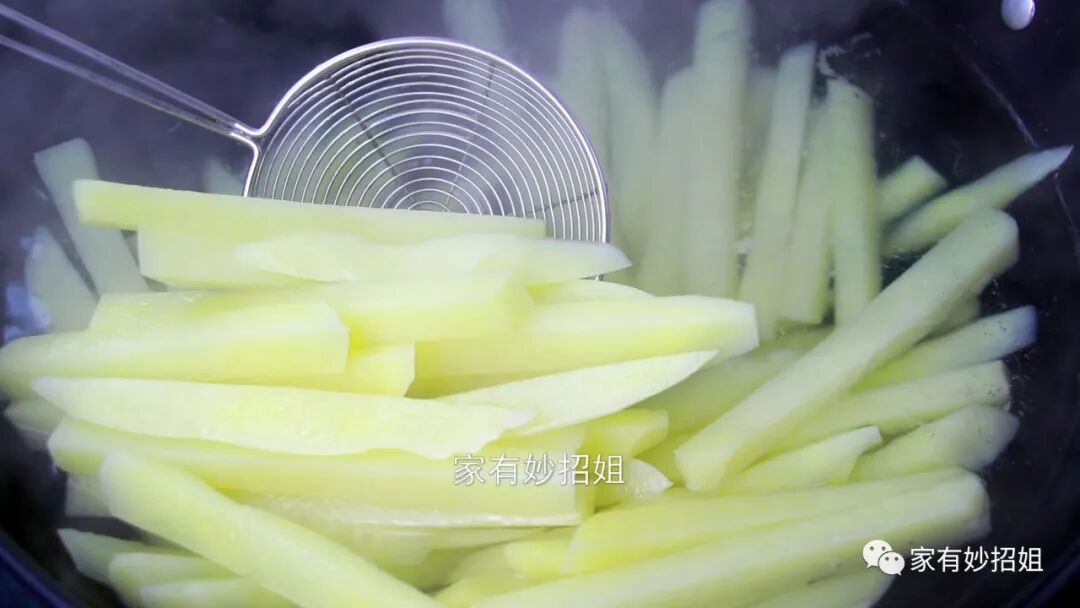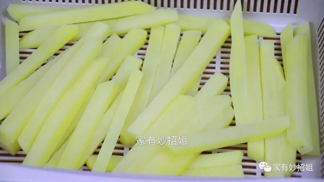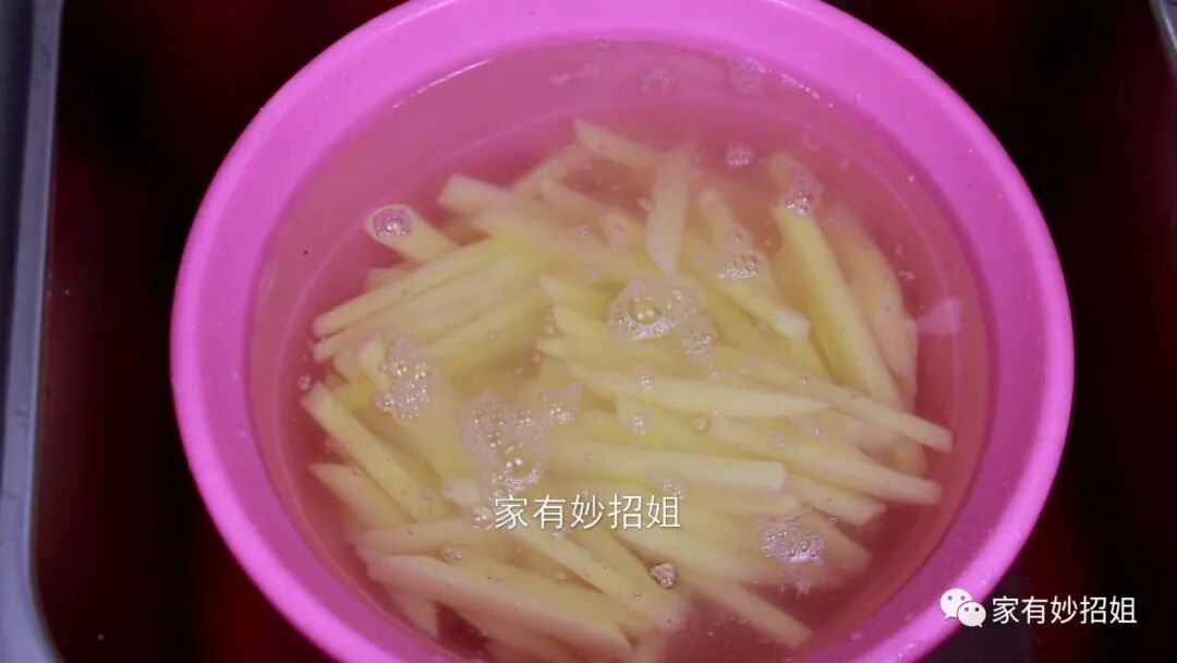 我们都知道,土豆是属于淀粉类的食物,将土豆条切好后就需要放入清水中泡一泡,将土豆表面的淀粉给它清洗干净,以免土豆因为氧化而出现发黑的情况。大概浸泡上十分钟的样子,我们再更换几盆清水,把土豆上的淀粉彻底的清洗掉。