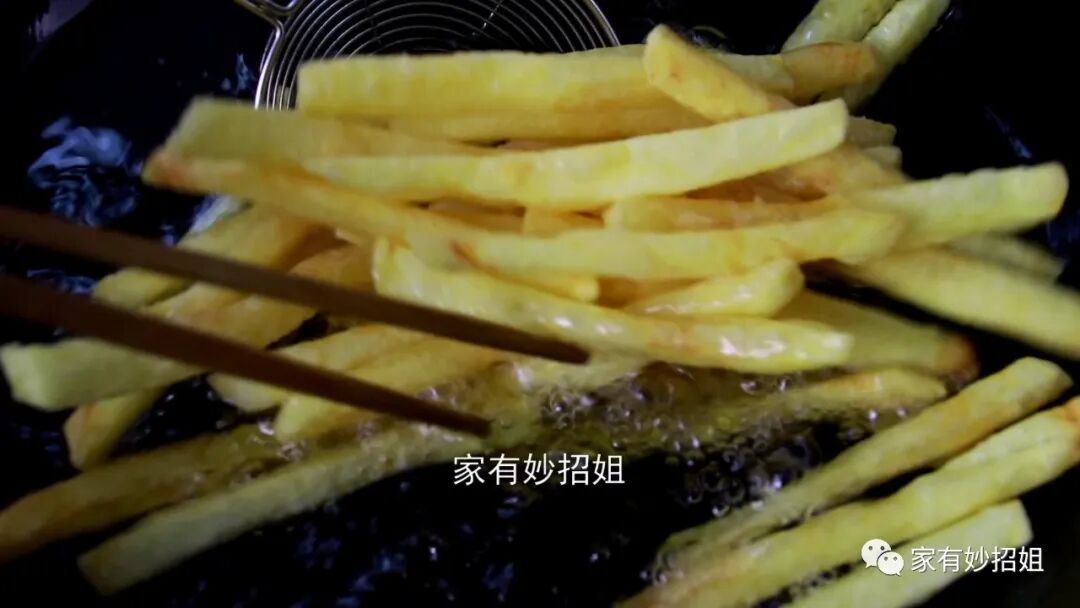 就这样一直炸,直到土豆条看起来已经变黄了,我们就可以关火,把它捞出来沥掉表面的油,这样薯条就炸好了。